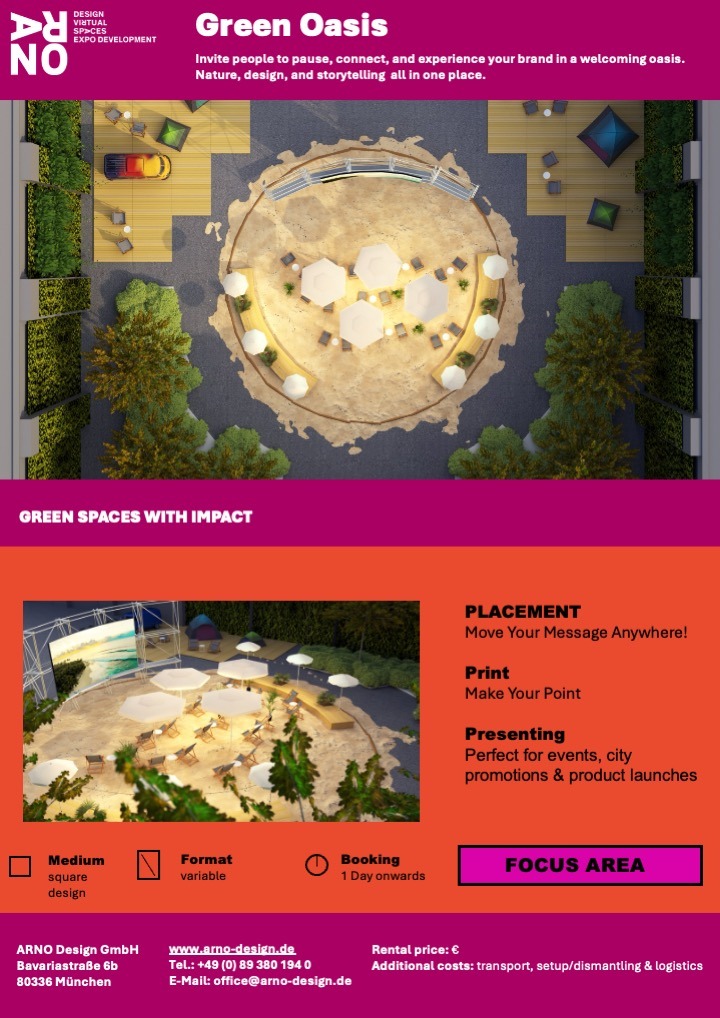 Diese lebendige Installation verwandelt Innenhöfe und öffentliche Plätze in lebendige Treffpunkte. Eine weitläufige, kreisförmige Sandlandschaft lädt zum Spielen und Verweilen ein, umrahmt von warmen Holzsitzgelegenheiten und Grünpflanzen. Ein integrierter LED-Bildschirm bringt Bewegung und Botschaften ins Spiel und macht den GreenCircle zu einem Ort der Entspannung und Begegnung.