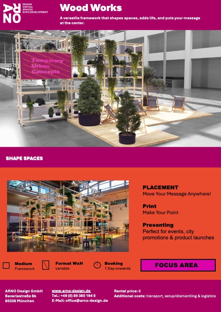 Diese modulare Holzkonstruktion bietet vielseitige Möglichkeiten für Präsentation und Gestaltung. Sie kann Poster, Bildschirme und Pflanzen präsentieren oder zu größeren Kompositionen kombiniert werden, die eine eigene architektonische Landschaft schaffen. Wood Works ist flexibel in Größe und Zweck und passt sich seiner Umgebung an, indem es Räume gestaltet, die informieren und verbinden.