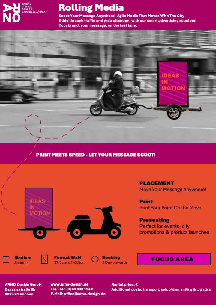 Lernen Sie unseren mobilen Werbescooter kennen – ein kompaktes Fahrzeug, das eine maßgeschneiderte Werbetafel durch die Stadt zieht. Er wurde für hohe Sichtbarkeit im städtischen Raum entwickelt und bringt Ihre Marke in Bewegung und direkt vor die Augen Ihres Publikums. Auffällig und dafür gemacht, sich mit dem Puls der Stadt zu bewegen.
