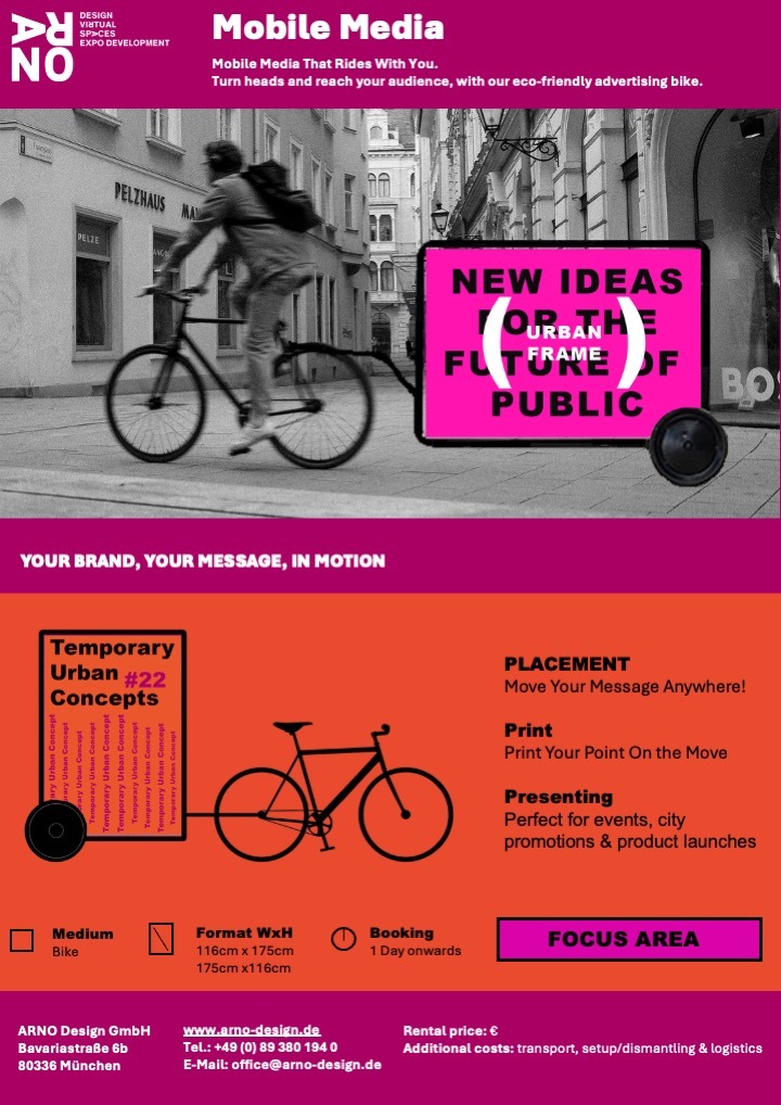 Unser Werberad bringt Ihre Marke direkt auf die Straße – mit vertikalen und horizontalen Werbeflächen für maximale Wirkung. Pedalbetrieben, flexibel und zu 100 % emissionsfrei ist es die clevere, nachhaltige Art, in städtischen Umgebungen aufzufallen.