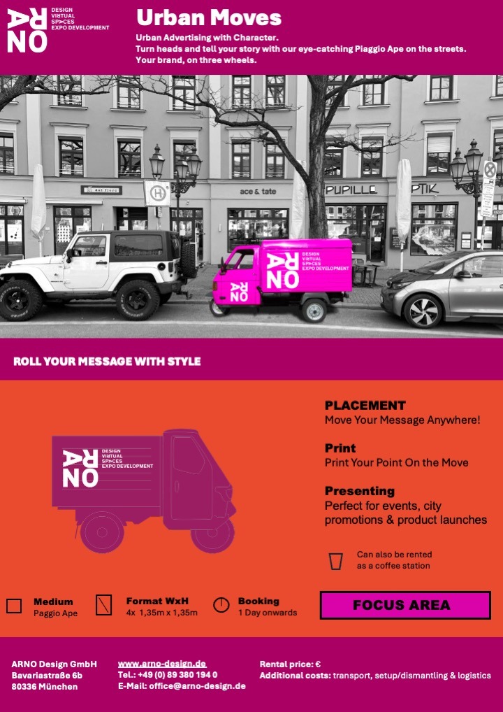 Unsere legendäre Piaggio Ape ist ein rollender Blickfang – komplett mit Ihrem Markenzeichen versehen, um Ihr Unternehmen oder Ihr neuestes Produkt zu präsentieren. Kompakt, charismatisch und unübersehbar bringt sie Ihre Botschaft mitten ins Stadtzentrum. Perfekt für Werbeaktionen, Produkteinführungen oder einfach nur, um Aufmerksamkeit zu erregen.