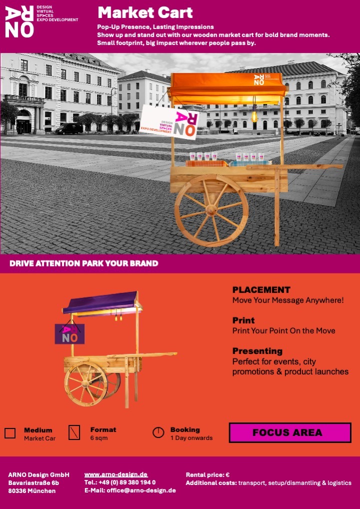 Unser kompakter Marktwagen aus Holz ist wie geschaffen für authentische Markenerlebnisse. Ob in einer Messehalle oder auf der Straße – er ist die perfekte Bühne für Produktplatzierungen, Verkostungen oder zum Anknüpfen von Gesprächen. Mobil, charmant und so konzipiert, dass er überall Neugier weckt.