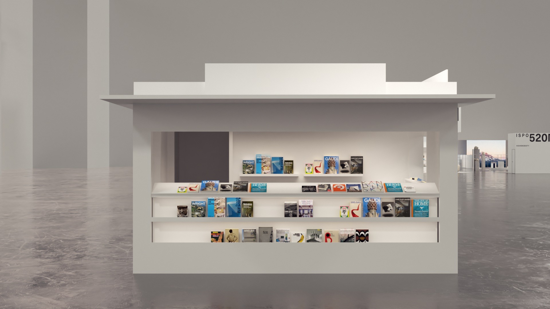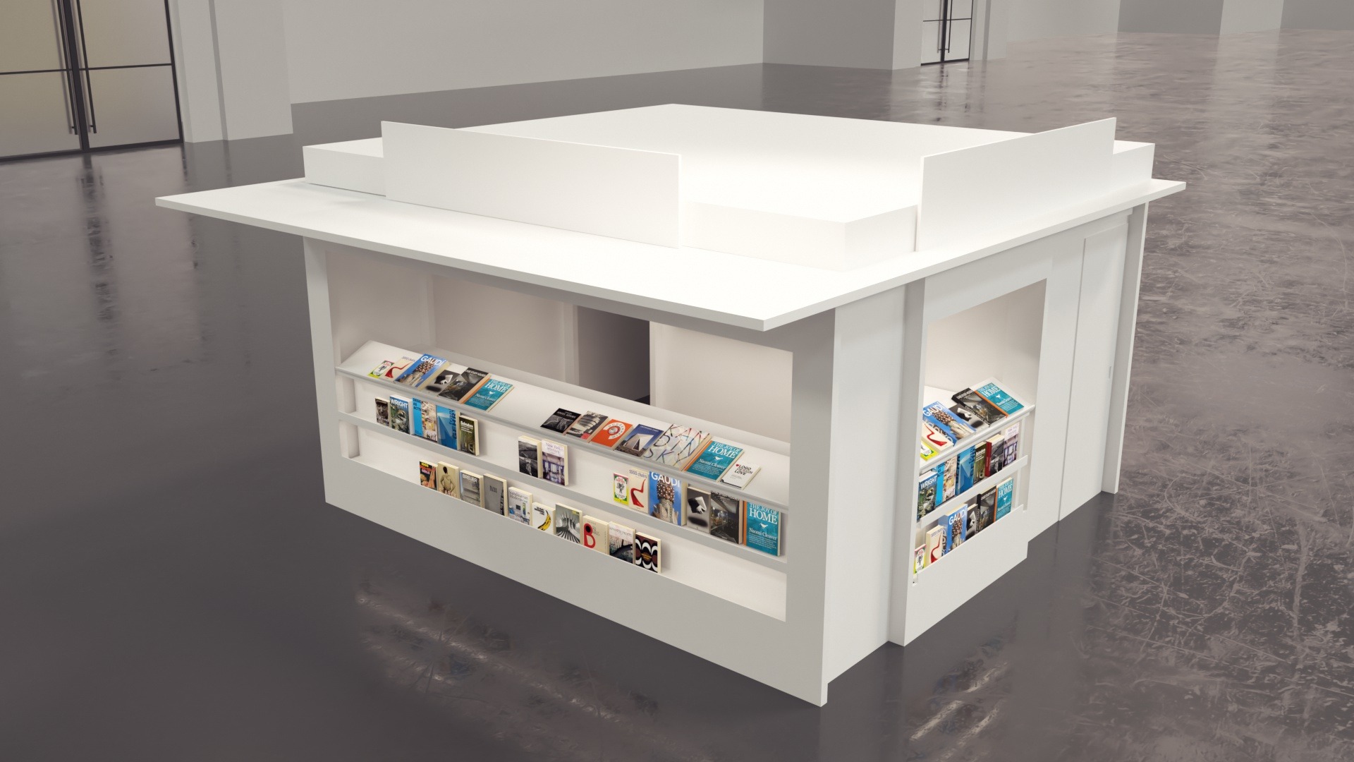 Multifunktionaler Brand.Design Kiosk als kompakte Highlight-Fläche. Modulares Möbel-System für Bücher- und Zeitschriftenauslage, Empfang und Info sowie Kaffee- und Snackbar mit klarem, stimmigem Markenauftritt. Zweiseitig offene Front für schnelle Bedienung und direkte Zugänglichkeit; rückseitige Stauraum- und Technikzone mit Kasse, Kühlung und Wasser: sauber getrennt, effizient organisiert, sofort betriebsbereit.